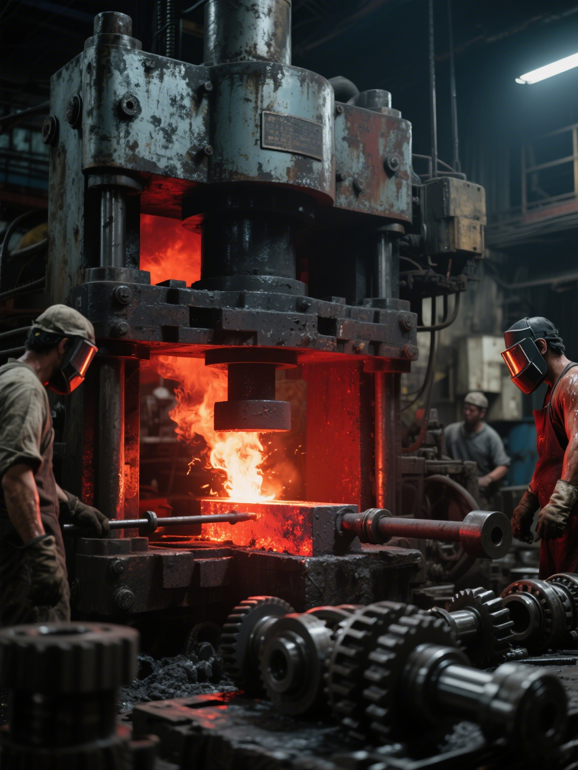 Presses metal billets to deform them, improving mechanical properties, used to make critical parts like engine blades.